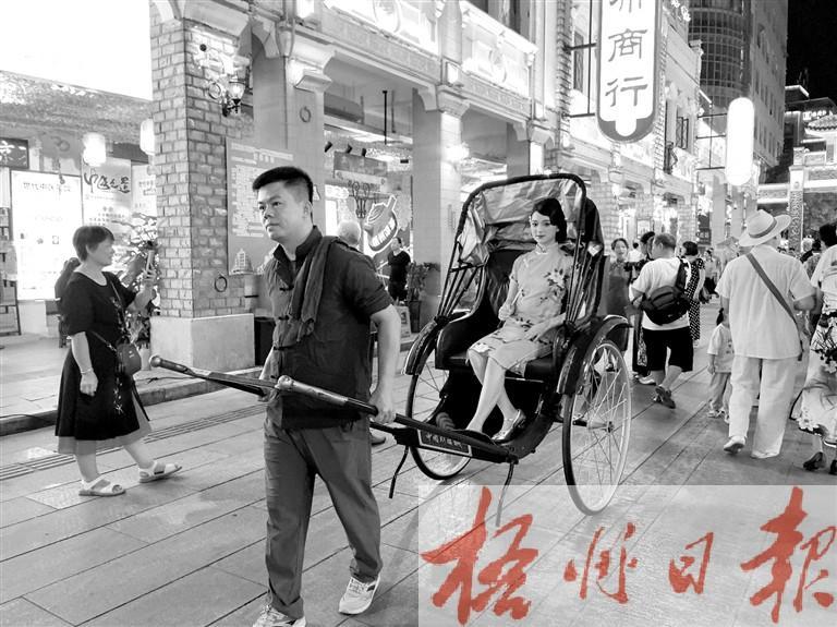 10月15日19时许,骑楼城已经霓虹闪烁。从骑楼城牌坊往十字街方向走去,只见身穿长袍马褂、旗袍长裙等服装的演员正在演绎民国时期骑楼儿女生活的真实场景:商贩挑来米担在路边摆卖,车夫拉着黄包车赶路,报童挥舞着报纸穿梭吆喝,还有售卖鸡仔饼、云片糕、钵仔糕、糖葫芦的摊贩穿行街区,不少市民游客纷纷停下脚步品尝购买,或与演员合影。